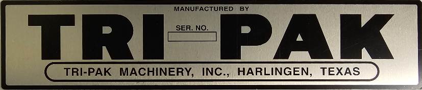 Your machine's Serial Number can be found on an aluminum plaque bearing the Tri-Pak logo, usually stuck to the side of the machine or on or near the control panel.